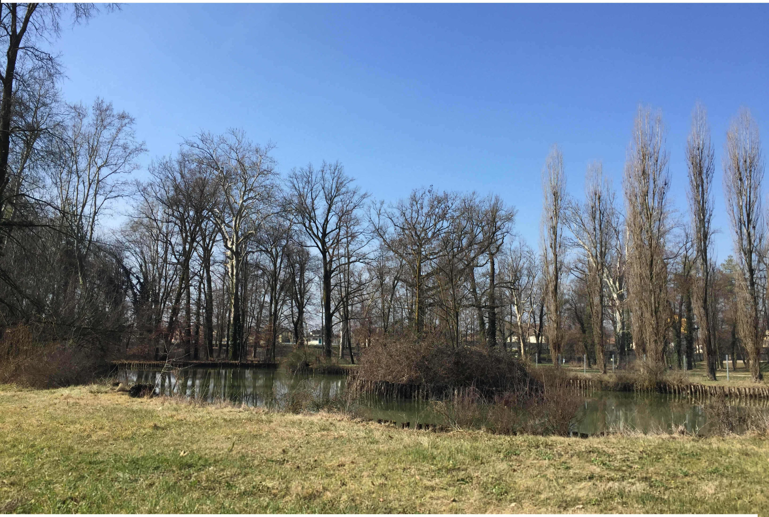Il bosco vede la presenza di frassini, tigli e ippocastani, pioppi, platani, olmi, robinie, aceri carpini, ginko biloba, ed altre essenze.
