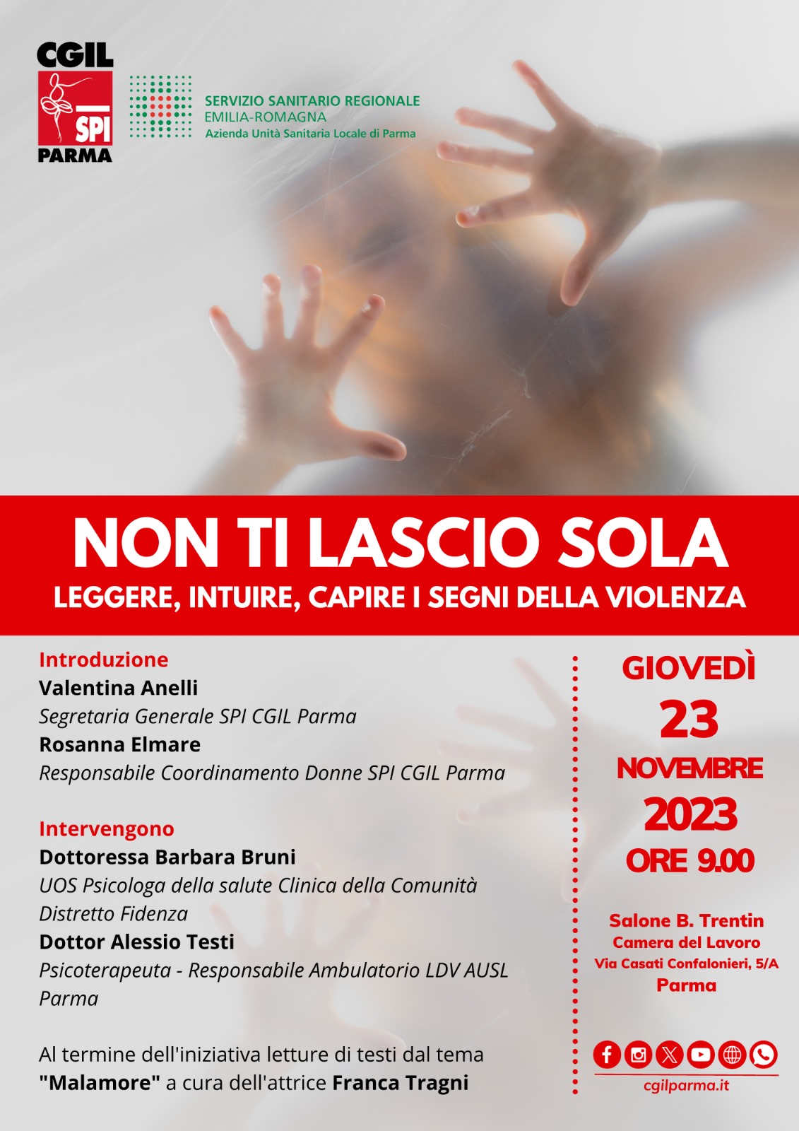 Giovedì 23 novembre alle 9 nel salone “Bruno Trentin” della Camera del Lavoro di Parma, si terrà l’incontro dal titolo “Non ti lascio sola. Leggere, intuire, capire i segni della violenza”. Intervengono gli specialisti dell’Azienda Usl di Parma, Barbara Bruni, direttrice UOS Psicologia della Salute, Clinica e di Comunità e Alessio Testi, psicoterapeuta, responsabile dell’ambulatorio Liberiamoci dalla Violenza, per uomini maltrattanti. Introducono Valentina Anelli, segretaria generale Spi Cgil Parma e Rosanna Elmare, responsabile Coordinamento donne Spi Cgil Parma. A conclusione dell’incontro, l’attrice Franca Tragni proporrà delle letture dal tema “Malamore”.