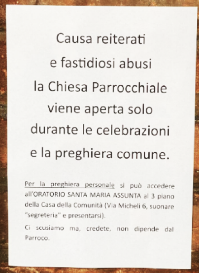 Il comitato Giù le mani da Parma prende atto da un cartello appeso da un parroco esasperato, dell’ennesimo attentato alla libertà di culto ed alla sicurezza ai danni della Chiesa di San Leonardo, tanto che il parroco è costretto a chiudere l’area ai fedeli e ai credenti.