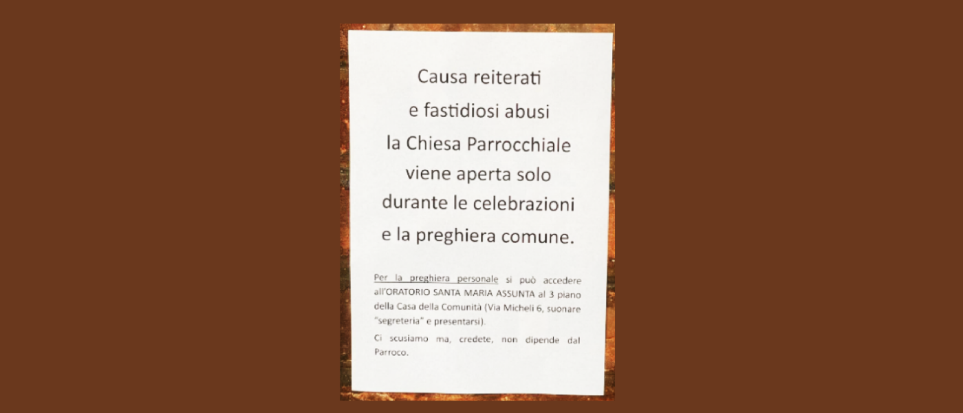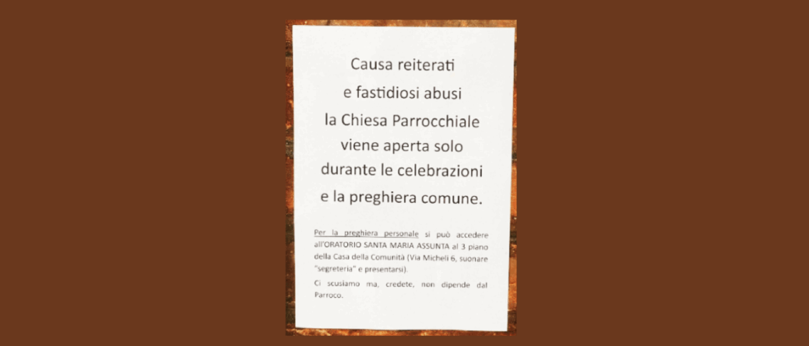 Il comitato Giù le mani da Parma prende atto da un cartello appeso da un parroco esasperato, dell’ennesimo attentato alla libertà di culto ed alla sicurezza ai danni della Chiesa di San Leonardo, tanto che il parroco è costretto a chiudere l’area ai fedeli e ai credenti.