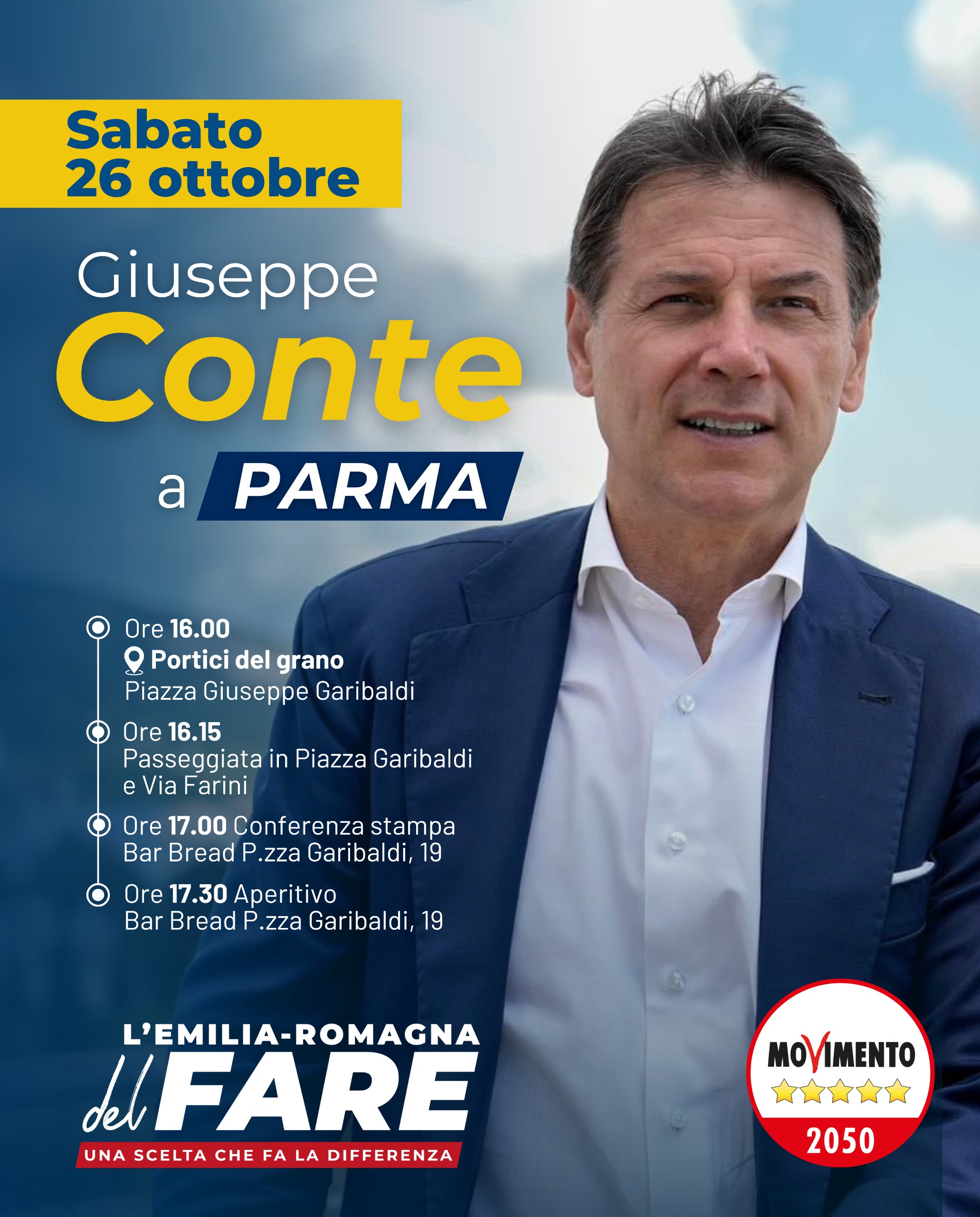 Sabato 26 ottobre il leader del M5S Giuseppe Conte sarà a Parma per sostenere la lista del M5S che si presenterà alle regionali dell’Emilia Romagna.