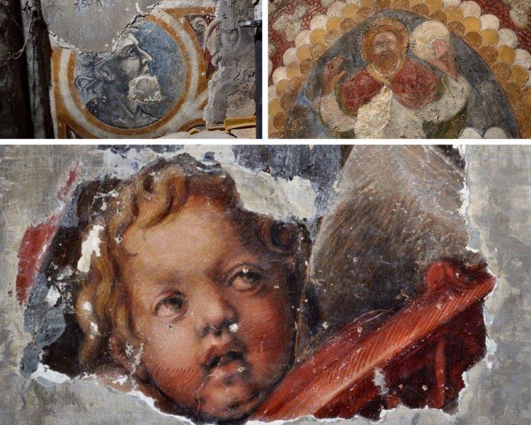La scoperta degli affreschi – negati alla vista dei fedeli già nel 1578, perché non aderenti ai canoni ecclesiastici del periodo successivo al Concilio – si inserisce nel percorso come il più benvenuto degli imprevisti. A causa delle infiltrazioni e delle lesioni delle murature, non tutte le parti riemerse potranno essere recuperate e rivedere la luce. È però certo che si farà il massimo per ridare lustro e brillantezza al cielo stellato e alle foglie d’oro – che, sulle vele, fanno da corollario alla figura del Cristo Pantocratore – alla straordinaria cromia del volto e alla rappresentazione di Sant’Orsola, al putto cinquecentesco e alla testa di un papa non ancora individuato.
