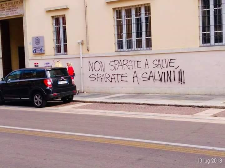 Questa scritta è apparsa in via Bixio, contro le politiche sull’immigrazione del Governo: “Giù le mani dai migranti” (leggi anche “Non sparate a salve, sparate a Salvini“).