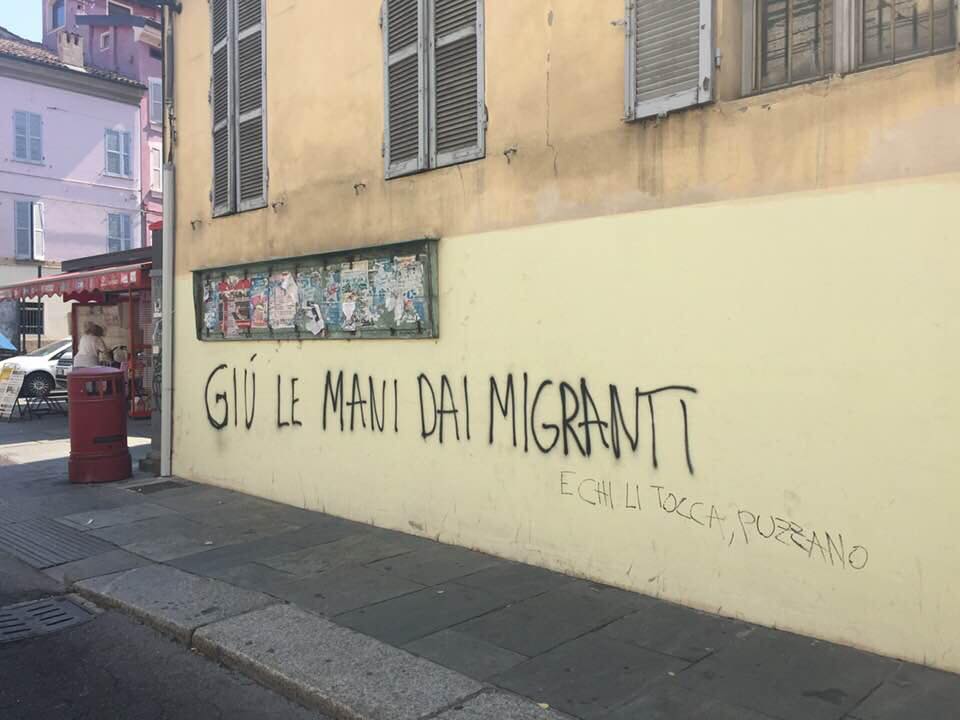 Questa scritta è apparsa in via Bixio, contro le politiche sull’immigrazione del Governo: “Giù le mani dai migranti” (leggi anche “Non sparate a salve, sparate a Salvini“).