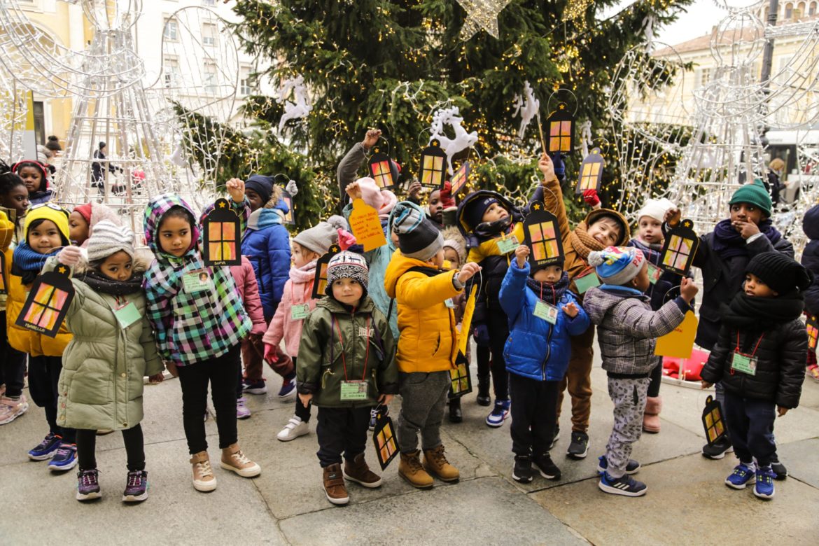Ai piedi dell’alto abete, hanno alzato le lanterne natalizie costruite durante il laboratorio scolastico in preparazione alle festività.