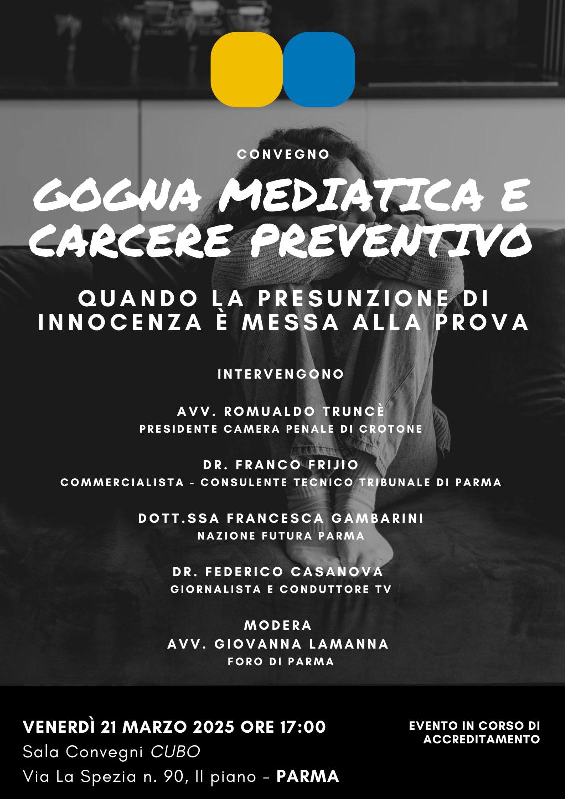 Nel pomeriggio di venerdì 21 marzo, alle ore 17, presso la sala convegni di CUBO (via La Spezia 90, Parma – 2° piano) si terrà il convegno dal titolo “Gogna mediatica e carcere preventivo. Quando la presunzione di innocenza è messa a dura prova”.
