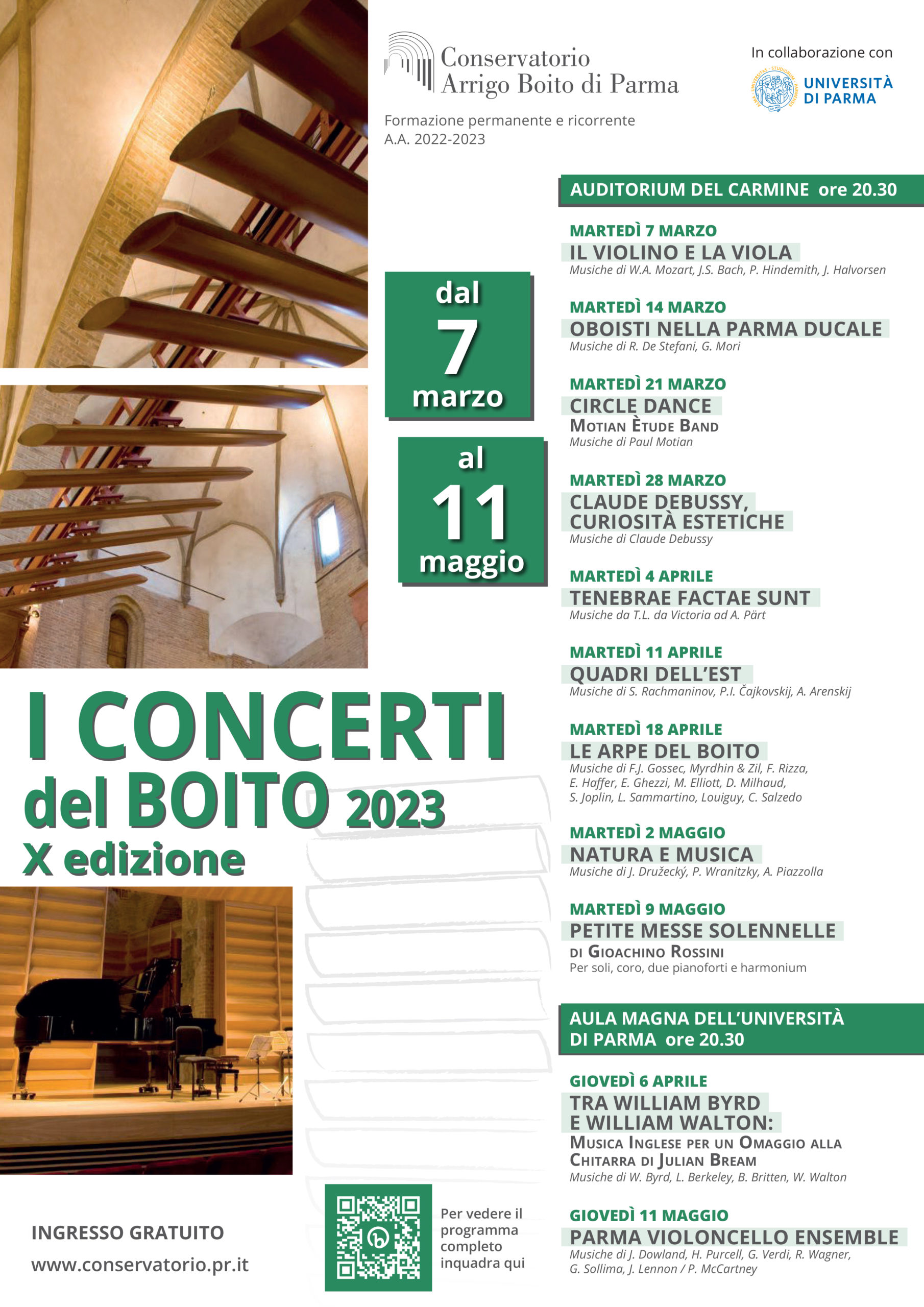 “I Concerti del Boito” sono inseriti nel programma di Attività di Formazione Permanente e Ricorrente del Conservatorio di Parma, coordinato dal prof. Pierluigi Puglisi. L’ingresso è libero e gratuito. Per informazioni e programma completo: Conservatorio di Musica “Arrigo Boito”, Strada del Conservatorio 27/a, www.conservatorio.pr.it.