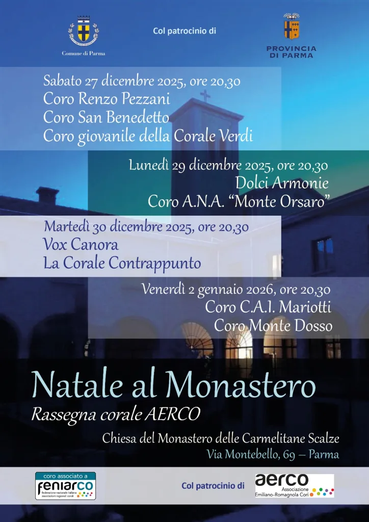 A testimonianza dell’attenzione delle istituzioni verso la diffusione della cultura musicale e del canto corale come strumento di condivisione e dialogo, l’iniziativa Natale in monastero è organizzata con il patrocinio del Comune di Parma e della Provincia di Parma, e si svolgerà a ingresso libero nella chiesa del Monastero di Clausura delle Carmelitane Scalze di Parma, in via Montebello 69, in quattro serate dal 27 dicembre al 2 gennaio, tutte alle ore 20,30.