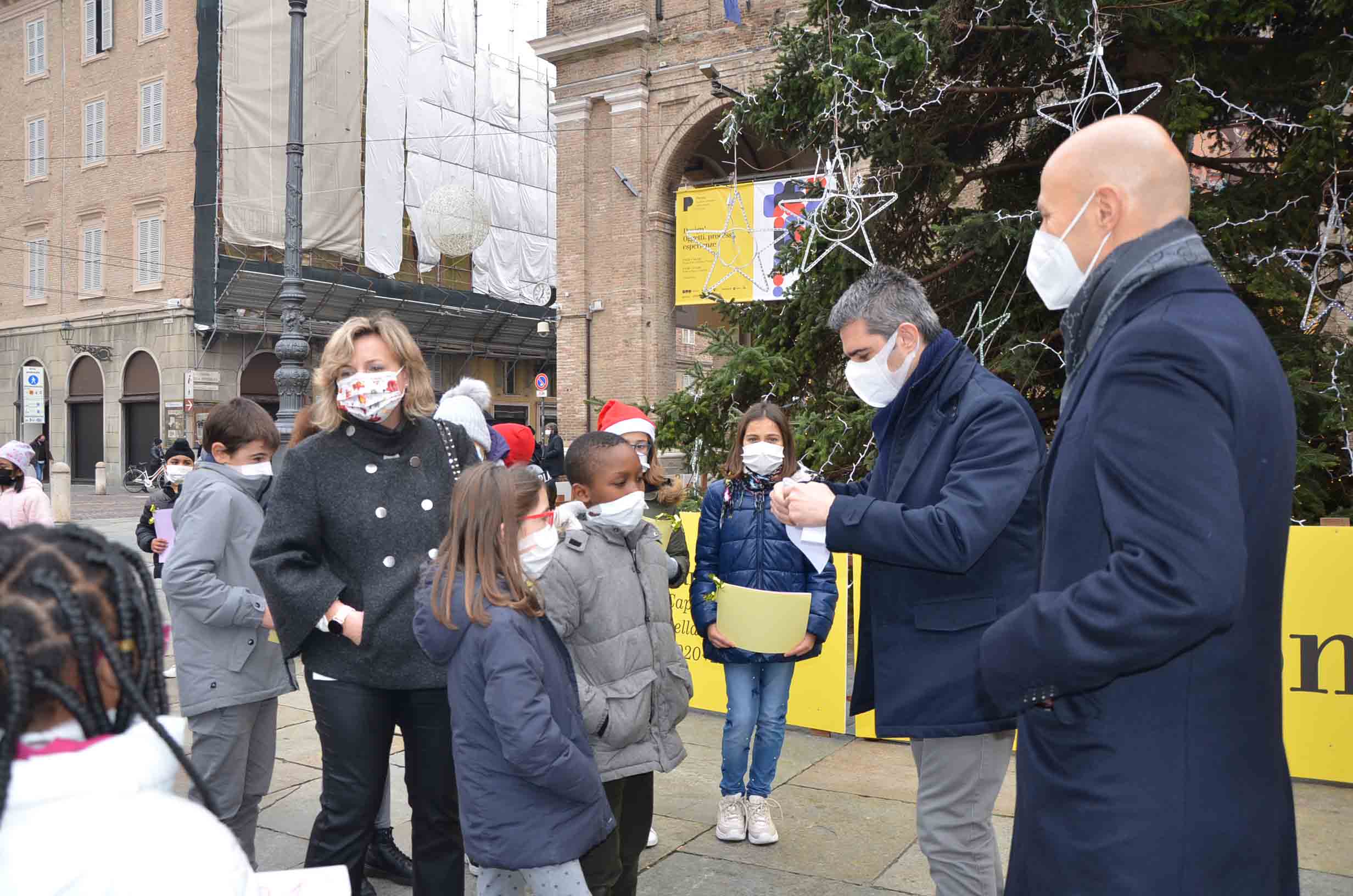 Pensieri, sogni e desideri dei bambini sotto l’albero di Natale. Il Sindaco, Federico Pizzarotti, con l’Assessore alla Scuola, Ines Seletti e l’Assessore al Commercio, Cristiano Casa, hanno salutato, questa mattina, i bambini delle classi 2^ B e 4 ^ B dell’Anna Frank che hanno riposto i loro pensierini di Natale nella cassetta dei sogni, situata alla base dell’albero di piazza Garibaldi.