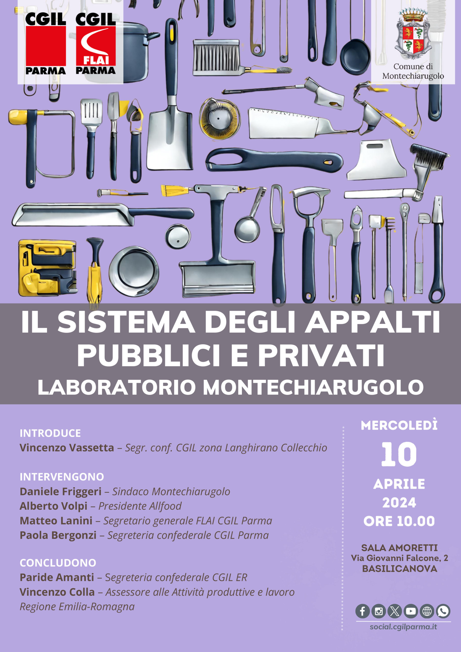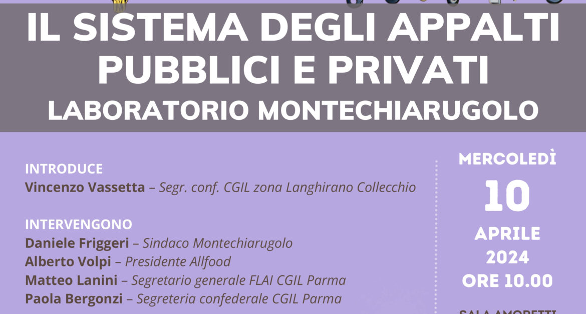 Per parlare di tutto questo e approfondire la possibile estensione delle buone prassi ad altri contesti analoghi è in programma per il prossimo mercoledì 10 aprile, alle ore 10, nella sala Amoretti di via Giovanni Falcone, 2 a Basilicanova, un incontro dal titolo “IL SISTEMA DEGLI APPALTI PUBBLICI E PRIVATI. LABORATORIO MONTECHIARUGOLO”, promosso da CGIL zona Langhirano Collecchio insieme a FLAI CGIL Parma, con il patrocinio del Comune di Montechiarugolo.
