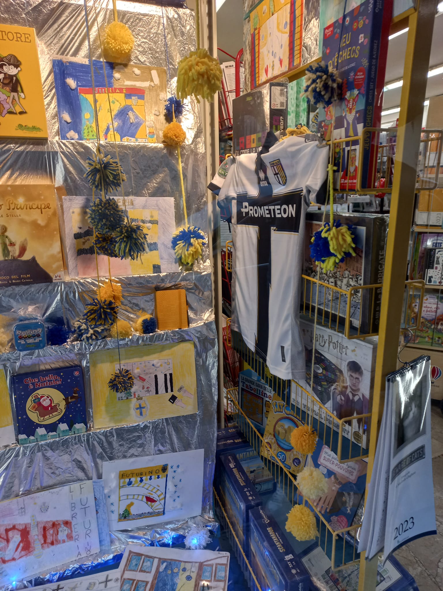 La classe 4^ A della Scuola Primaria del Convitto Maria Luigia espone alla Libreria Futurino, in via Montegrappa: i bambini hanno realizzato per l’occasione tanti ponpon – gialli, blu e gialloblu, bianchi e neri – utilizzando la lana avanzata dalle nonne e cartoncini anch’essi riciclati (presi dagli album da disegno). Ogni alunno ha progettato una proposta su fogli da disegno diventati parte integrante dell’allestimento; in accordo con il libraio, invece di allestire solo un angolo della vetrina i lavori sono stati sparsi in sinergia e sintonia con il negozio ospitante: come risultato il mix fra libri e pon pon offre un’immagine d’insieme suggestiva con i colori della città e della squadra crociata.