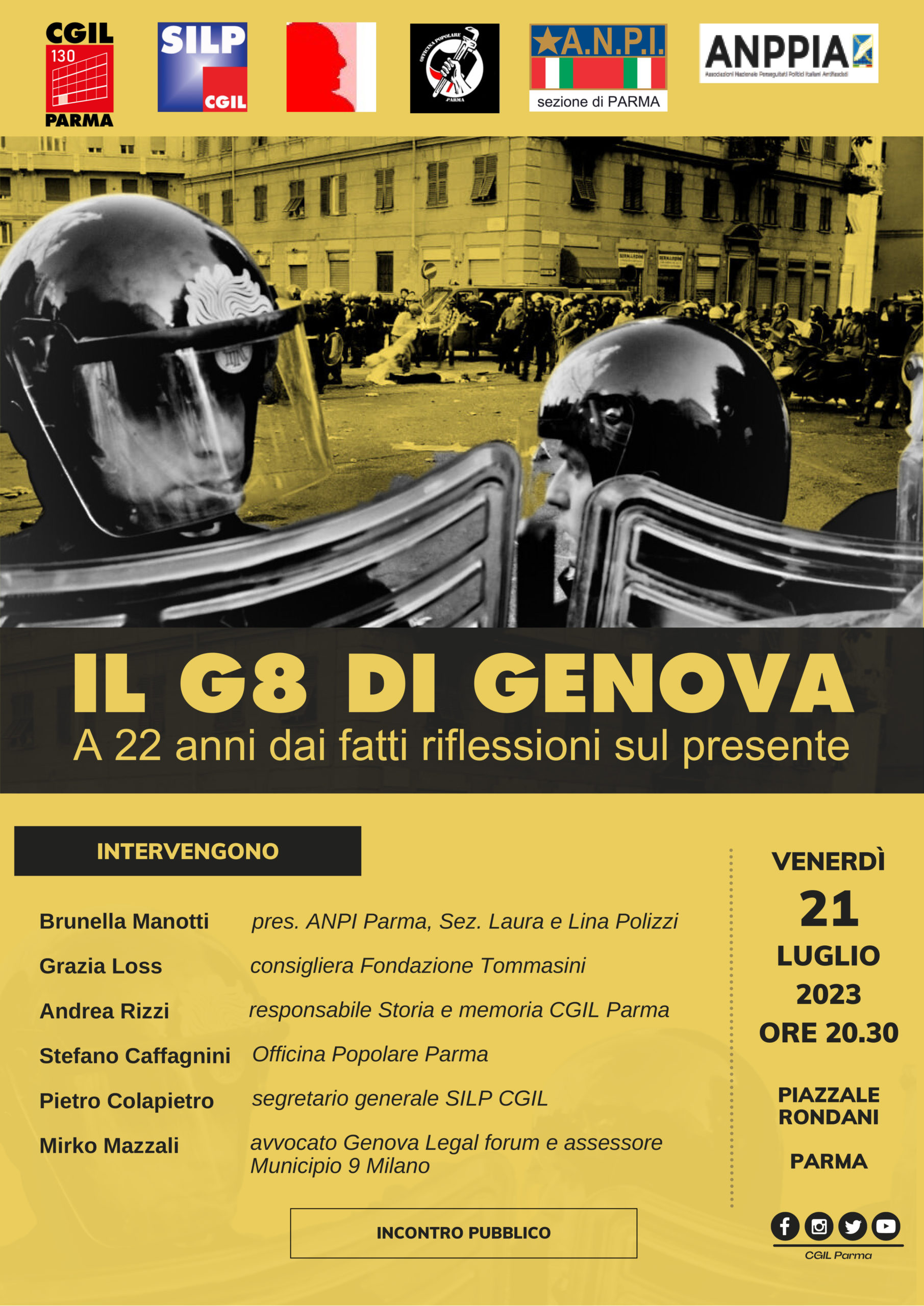 Sono passati 22 anni ma i fatti del G8 di Genova del luglio 2001 continuano ad interrogarci e a riproporre la loro drammatica attualità. Tante le questioni ancora aperte, su cui CGIL Parma, SILP CGIL nazionale, Fondazione Tommasini, Officina Popolare Parma, ANPI Sezione di Parma e ANPPIA cittadina intendono ragionare in un’iniziativa pubblica promossa per il prossimo venerdì 21 luglio, alle ore 20.30, in piazzale Rondani (adiacenze Monumento alle Barricate), con il titolo “Il G8 di Genova. A 22 anni dai fatti riflessioni sul presente”.