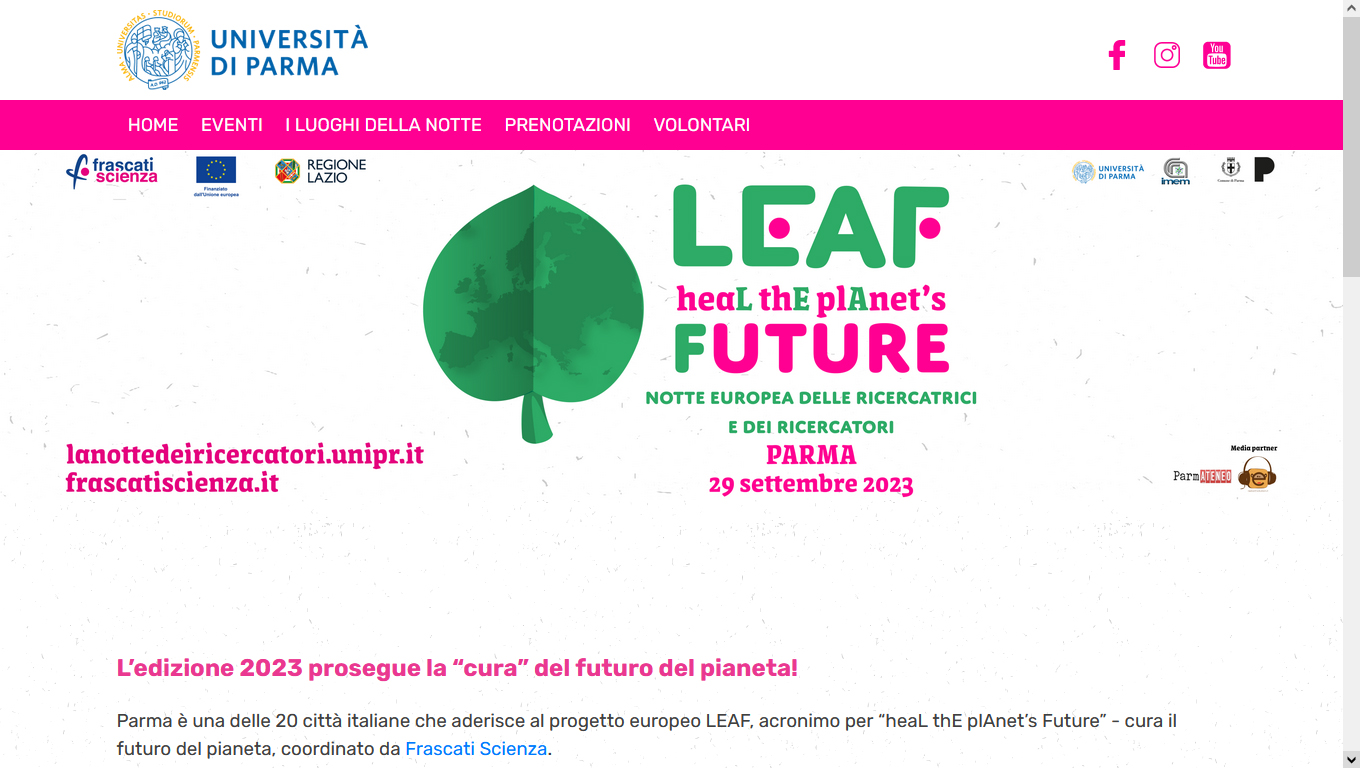 La manifestazione di Parma rientra anche quest’anno nell’ambito del progetto LEAF, coordinato a livello nazionale da Frascati Scienza, che vede la partecipazione di numerose università ed enti di ricerca italiani. LEAF, acronimo per “heaL thE plAnet’s Future”, cura il futuro del pianeta, è finanziato dal programma HORIZON-MSCA-Citizens-2022 della Commissione Europea, nell’ambito delle azioni Marie Skłodowska-Curie.