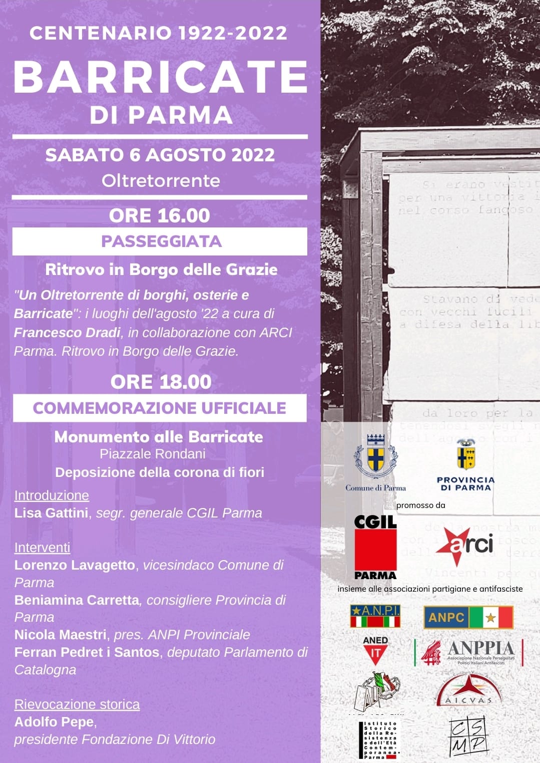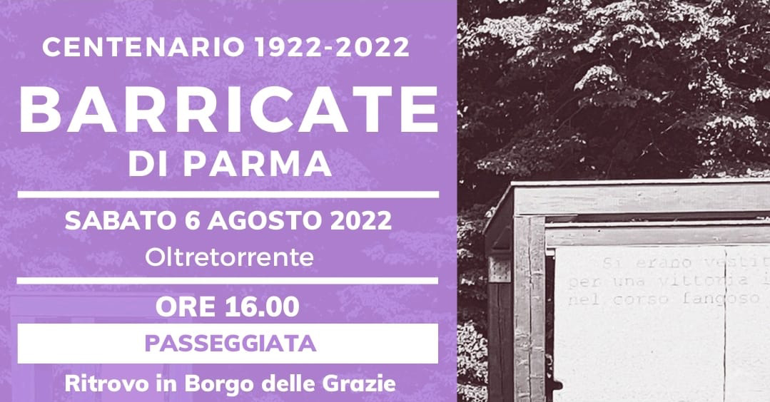 Il programma, arricchito rispetto alla scaletta degli anni passati a sottolineare il significato di questo anniversario, prevede alle ore 16.00, una PASSEGGIATA nei luoghi dell’agosto 1922, in collaborazione con ARCI Parma, a cura di Francesco Dradi (autore del recente volume “Guida alle Barricate”, edito da Chiara comunicazione). Punto di ritrovo per la visita è Borgo Delle Grazie.