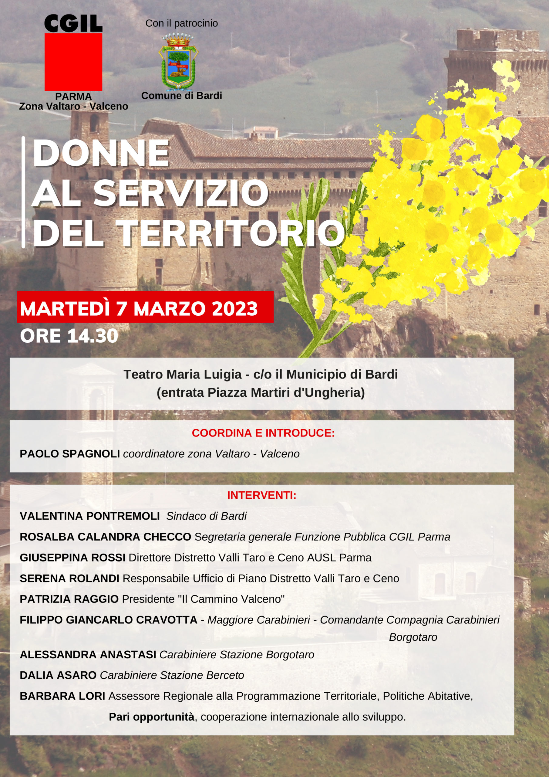 L’incontro, promosso dalla CGIL zona Valtaro e Valceno con il patrocinio del Comune di Bardi, si inserisce nell’ambito degli eventi organizzati in occasione della Giornata internazionale delle donne. Introdotto e moderato da Paolo Spagnoli, coordinatore CGIL zona Valtaro Valceno, vedrà gli interventi di Valentina Pontremoli, Sindaco di Bardi, Rosalba Calandra Checco, Segretaria generale Funzione Pubblica CGIL Parma, Giuseppina Rossi, Direttore Distretto Valli Taro e Ceno AUSL Parma, Serena Rolandi, Responsabile Ufficio di Piano Distretto Valli Taro e Ceno, Patrizia Raggio, Presidente “Il Cammino Valceno”, Filippo Giancarlo Cravotta, Maggiore Carabinieri e Comandante Compagnia Carabinieri Borgotaro, Alessandra Anastasi, Carabiniere Stazione Borgotaro, Dalia Asaro, Carabiniere Stazione Berceto, e Barbara Lori, Assessore Regionale alla Programmazione Territoriale, Politiche Abitative, Pari opportunità, cooperazione internazionale allo sviluppo.