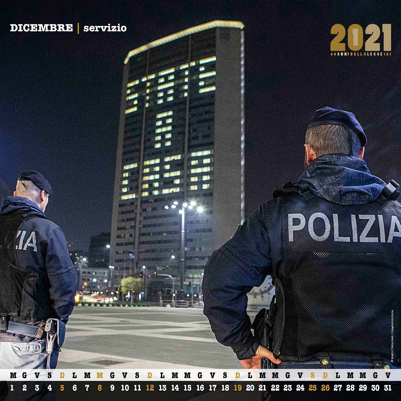Tre immagini in particolare simboleggiano lo spirito di servizio: il mese di marzo con l’ispettore Santa Perrone e la piccola Elena Luisi salvata dai suoi rapitori, il mese di agosto con il reparto mobile che presta soccorso agli abitanti della Val di Fiemme, il mese di dicembre con i poliziotti impegnati nell’attività connessa all’emergenza Covid 19, a salvaguardia della salute pubblica.