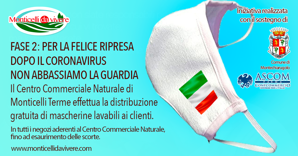 “Fase 2, per la felice ripresa dopo il Coronavirus non abbassiamo la guardia!”: con questo slogan parte la campagna di sensibilizzazione al rispetto delle buone pratiche volte ad arrestare i contagi da Covid 19 attivata da Monticelli da Vivere, il Centro Commerciale Naturale di Monticelli Terme.