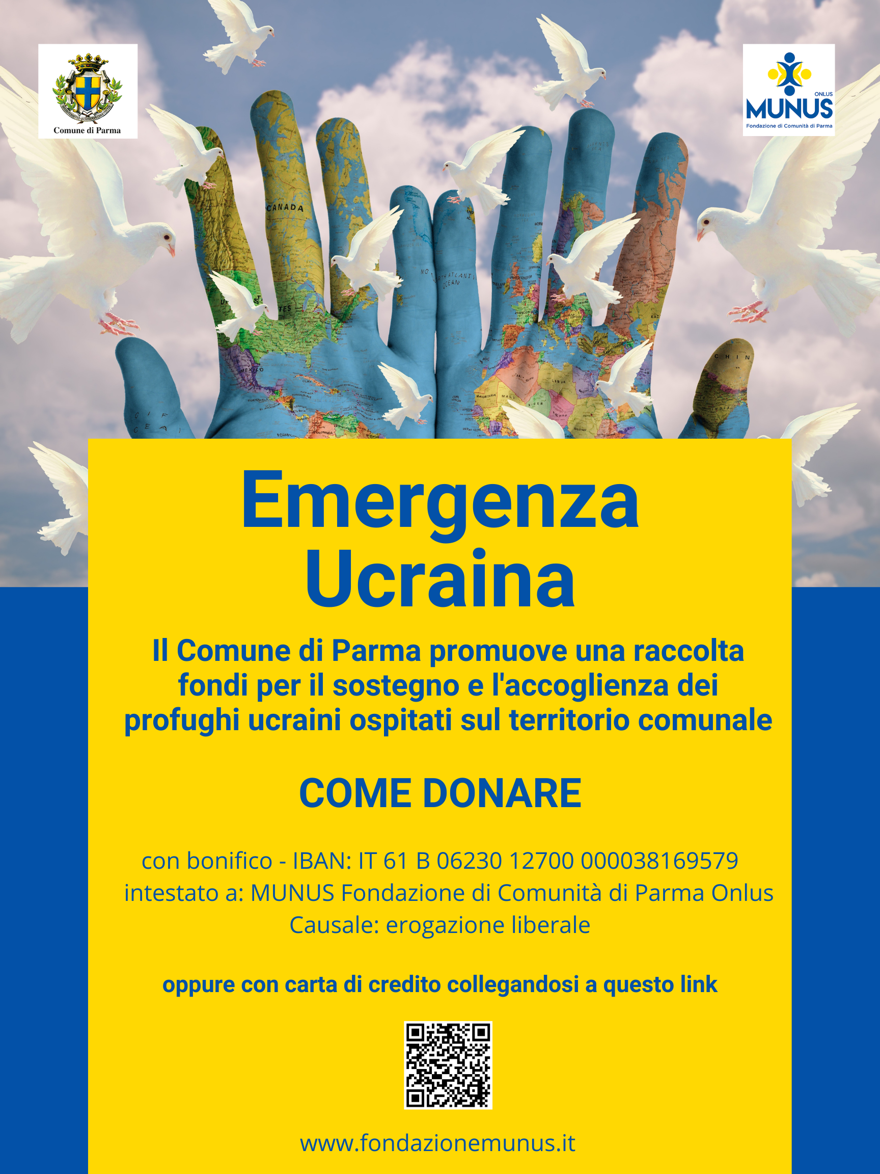 – E’ partita una raccolta fondi per l’accoglienza e il sostegno delle persone che si trovano nel territorio comunale e provinciale. Tutte le informazioni sul sito di MUNUS Fondazione di Comunità di Parma Onlus (e nella locandina allegata). Le donazioni sono deducibili/detraibili ai fini dell’imposta sui redditi;