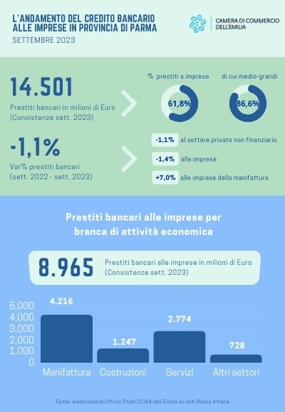 A fine settembre 2023, i prestiti erogati dal sistema di credito nella provincia di Parma sono risultati in diminuzione dell’1,1% rispetto alla stessa data dello scorso anno; gli impieghi bancari si sono così portati a 14,5 miliardi di euro.