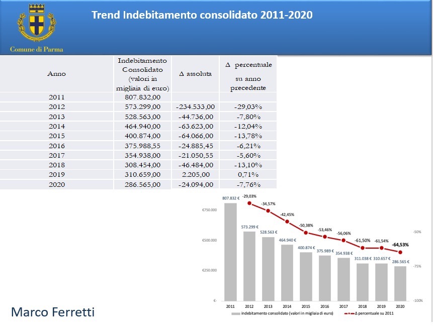 Il Comune di Parma ha un debito ridotto del 65% (da 807 mln a 286 mln di euro), è tra le realtà più solide d’Italia, ed è tornato da anni a investire sul suo futuro. Siamo tornati nella “White-List” di Cassa Depositi e Prestiti e la nostra “reputazione” è tra le più alte negli Enti Locali in Italia. Il resto, davvero, lo lascio tranquillamente e senza esitazione nel cassetto dei brutti ricordi. Fermo restando che sentire raccontare una storia in cui il debito non c’è stato è eticamente inaccettabile e altamente irrispettoso nei confronti di tutta una serie di soggetti: i Commissari Prefettizi che hanno gestito il Comune nelle more di nuove elezioni; tutti i dipendenti del Comune che molte volte sono andati al di là del mero lavoro di ufficio per risolvere problemi importanti, alcuni dei quali, quasi impossibili da spiegare in un “comizio elettorale; i Dirigenti, le Posizioni Organizzative, i Funzionari che hanno duramente lavorato in questi anni non solo per ripianare i debiti, ma per portare Parma a raggiungere risultati encomiabili (a mero titolo esemplificativo cito “Città creativa della gastronomia” UNESCO e Capitale Italiana della Cultura 20+21). In ultima analisi manca di rispetto a tutti i nostri Amministratori di Società Partecipate che si sono spesi e hanno messo il loro know-how a fattore comune per risolvere una situazione intricatissima, insieme a professionisti esterni, all’Ordine dei Dottori Commercialisti e all’Ordine degli Avvocati di Parma, con i quali abbiamo collaborato proficuamente.
