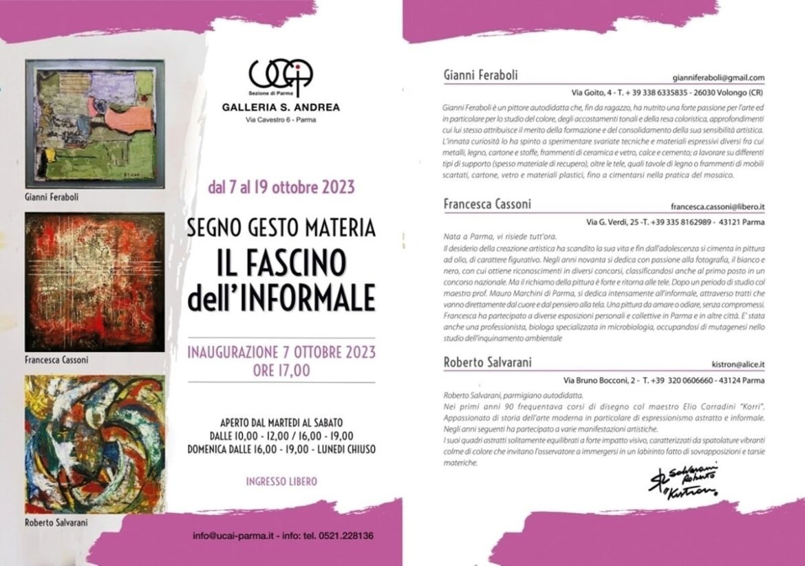 Fino al 19 ottobre sarà ancora possibile godere di una mostra organizzata da UCAI di Parma (Unione Cattolica Artisti Italiani) nella quale sono esposte le opere di Francesca Cassoni, Gianni Feraboli e Roberto Salvarani, che hanno espresso in questa collettiva il “fascino dell’informale” attraverso il segno il gesto e la materia.