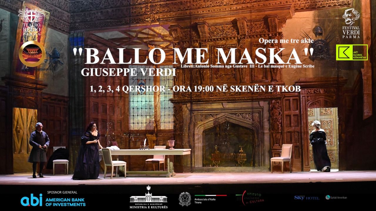 Un ballo in maschera debutta al Teatro Nazionale dell’Opera e del Balletto di Albania mercoledì 1 giugno 2022, ore 19.00, (repliche giovedì 2, venerdì 3, sabato 4 giugno 2022 ore 19.00) nell’allestimento del Teatro Regio di Parma di Giuseppe Carmignani del 1913, le cui scene dipinte su carta sono tornate a rivivere dopo l’accurato lavoro di ripristino a cura di Rinaldo Rinaldi, in collaborazione con la Soprintendenza Archeologia, Belle arti e Paesaggio per le province di Parma e Piacenza. Lo spettacolo vede la regia di Marina Bianchi, con il coordinamento dello spazio scenico e gli arredi di Leila Fteita, i costumi di Lorena Marin, le luci di Andrea Borelli, il video di Stefano Cattini, le coreografie di Michele Cosentino, e andrà in scena con la direzione di Deniola Kuraja sul podio dell’Orchestra e del Coro del Teatro Nazionale dell’Opera e del Balletto di Albania. In scenagli artisti del Teatro dell’Opera di Albania Eva Golemi / Lada Kyssy (Amelia), Dario Di Vietri / Milen Bozhkov (Riccardo), Armando Likaj / Kendi Lajos (Renato), Alla Pozniak (Ulrlica), Bledar Domi (Samuel), Xhieldo Hyseni (Tom), Renisa Laçka / Rovena Xhelili (Oscar), Artur Vera (Silvano), Erlind Zeraliu (Un Giudice / Un servo di Amelia).