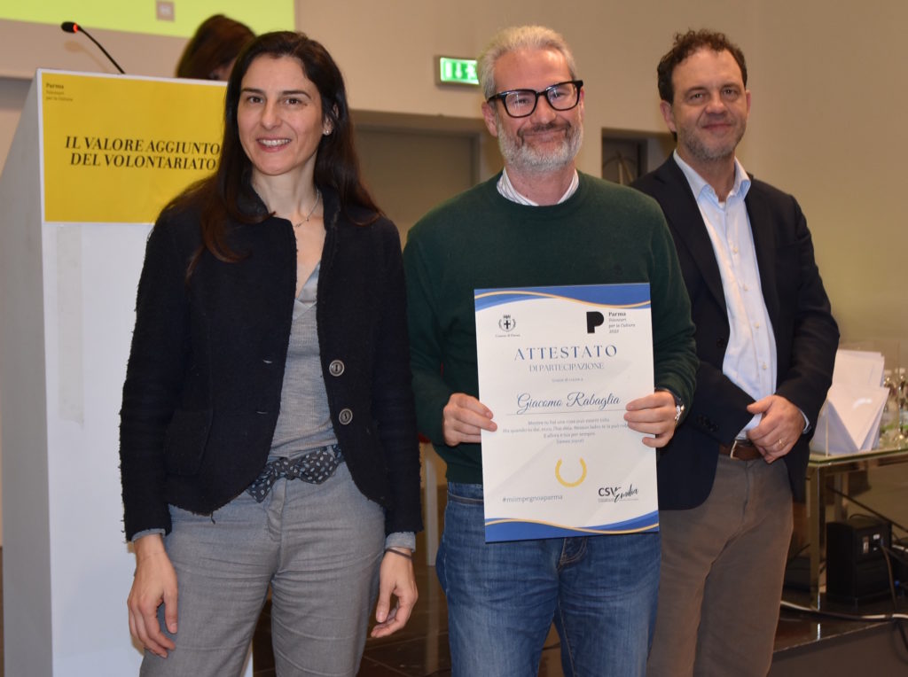 Chiamati per nome, a uno a uno i volontari sono saliti sul palco per ricevere il ringraziamento anche dai principali enti culturali della città: Fondazione Teatro Regio, Fondazione Teatro Due, Teatro al Parco, Fondazione Museo Glauco Lombardi, Cinema Astra, Cinema D’Azeglio, Fondazione Toscanini, Fondazione Monte Parma – Ape Museo insieme ad ASP ad Personam, Festival della lentezza e Interno Verde.