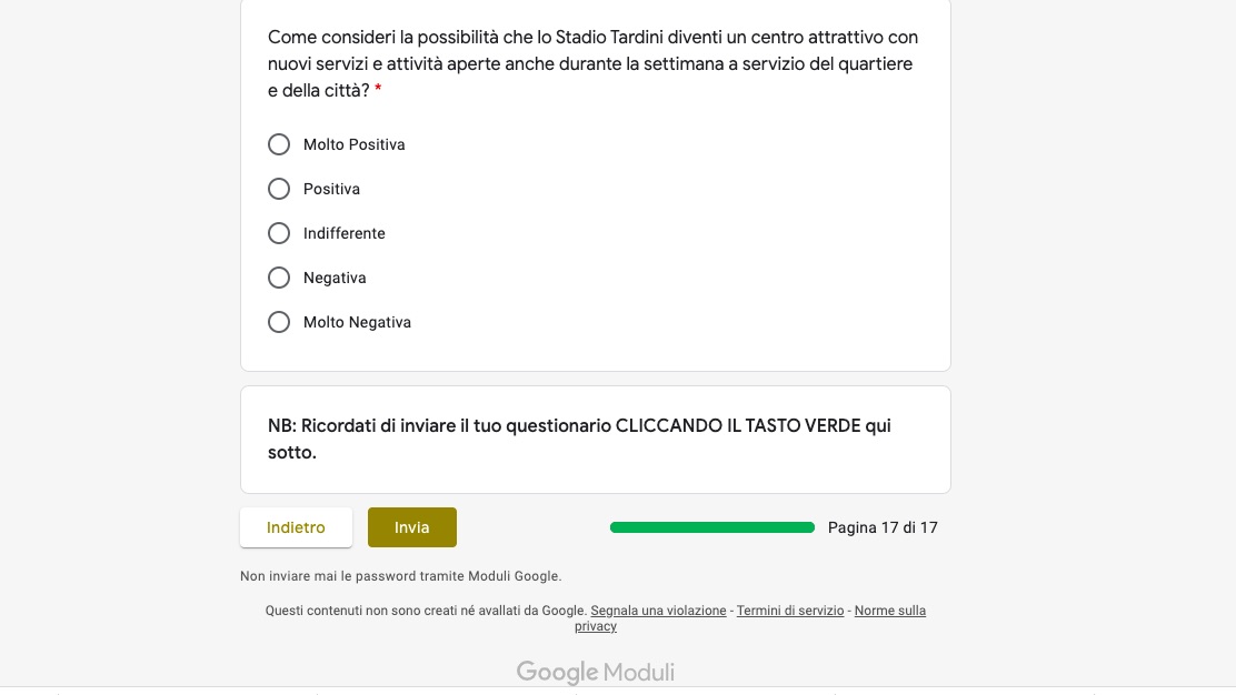 Ferma l’essenzialità del merito dell’intervento che sarà presentato (la cui valutazione è ovviamente prioritaria e determinante), la nota fin qui stonata della vicenda è il questionario sul progetto che il Parma Calcio sta diffondendo in questi giorni, immagino per stimolare la partecipazione dei parmigiani. (leggi)