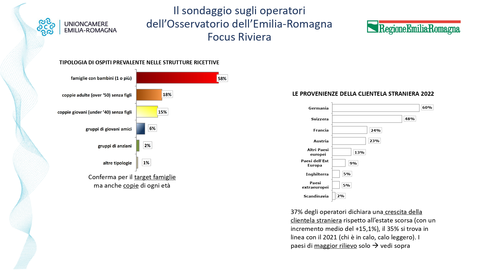 Ben il 37% degli operatori dichiara una crescita della clientela straniera rispetto all’estate scorsa (con un incremento medio parti al +15,1%) mentre il 35% degli operatori si trova in linea con il 2021. I clienti stranieri provengono dalle nazioni di lingua tedesca (Germania, Austria e Svizzera), ma è molto forte anche il flusso dalla Francia, dagli gli altri Paesi europei e da quelli dell’Europa dell’Est (Osservatorio turismo dell’Emilia-Romagna).