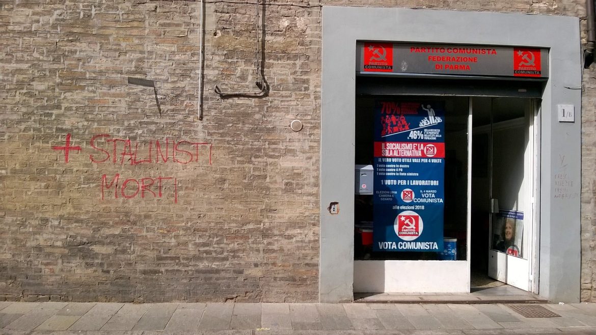 Imbrattata la sede del Partito Comunista di Parma con la scritta “Più stalinisti morti” di UG 20 Maggio 2018 20 Maggio 2018 41 E’ stata imbrattata la sede della Federazione di Parma del Partito Comunista. “Un vile e provocatorio atto anticomunista” denuncia il Partito. “Le provocazioni anticomuniste non passeranno! Avanti con il Partito Comunista!”