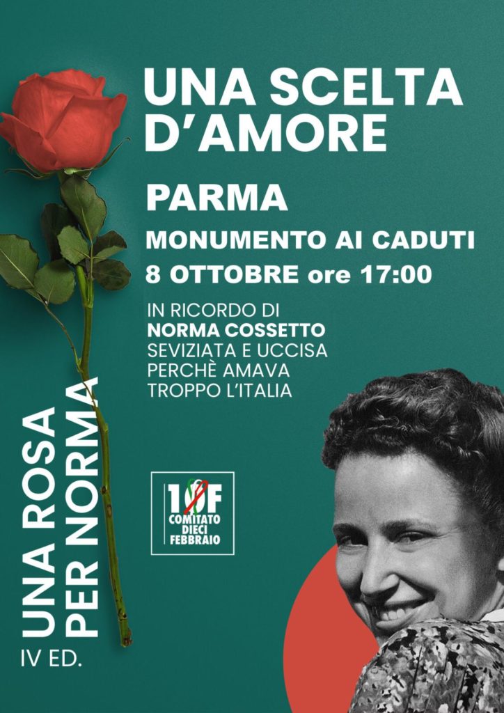 Si svolgerà il giorno 08 ottobre 2022, alle ore 17:00, in via Melloni davanti al Monumento ai Caduti, nella città di Parma, “Una rosa per Norma Cossetto”, la manifestazione promossa in tutta Italia dal Comitato 10 Febbraio e giunta alla quarta edizione, che intende onorare la memoria della giovane studentessa istriana, seviziata e uccisa nel 1943 dai partigiani di Tito.