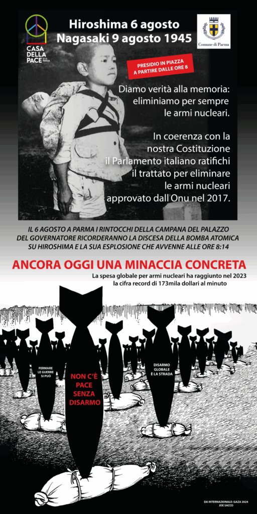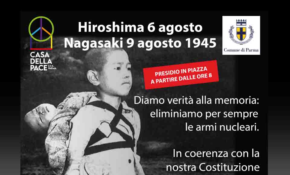 Martedì 6 agosto, a partire dalle 8, Comune di Parma e Casa della Pace organizzano un presidio in piazza Garibaldi in occasione della ricorrenza dello scoppio della bomba atomica a Hiroshima il 6 agosto e Nagasaki il 9 agosto 1945.