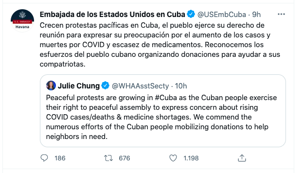 Qualche ora fa l’ambasciata degli Stati Uniti a Cuba ha dato un’interpretazione diversa dei fatti (circostanziandoli alla pandemia) e ha scritto su Twitter che “a Cuba crescono le proteste pacifiche. La popolazione esercita il diritto di assemblea per esprimere la propria preoccupazione per l’aumento dei casi e dei decessi per covid e per la carenza di medicinali. Riconosciamo gli sforzi del popolo cubano che organizza donazioni per aiutare i suoi compatrioti“.