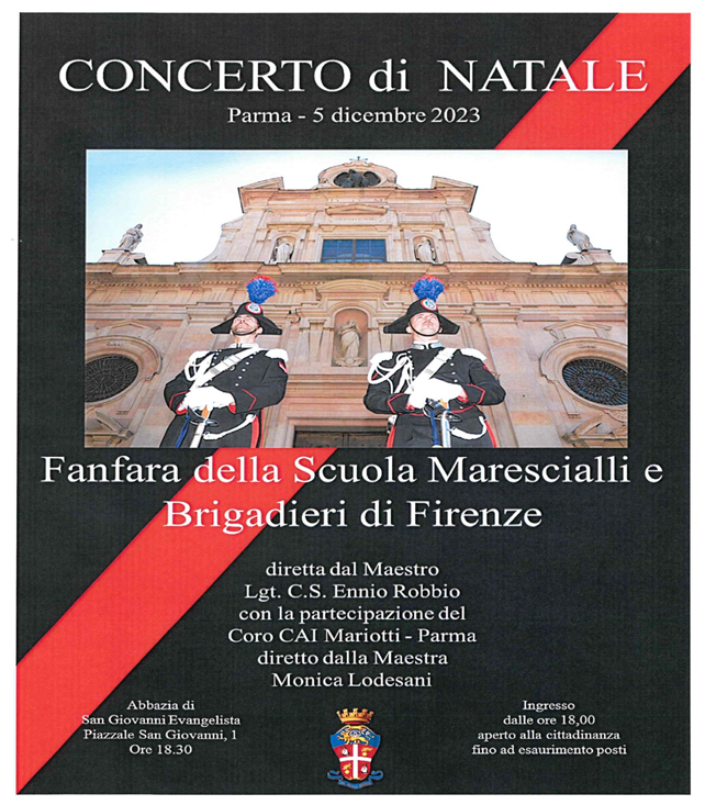 L’Associazione Nazionale Carabinieri, sezione di Parma, in collaborazione con il Comando Provinciale dell’Arma ha organizzato un “Concerto di Natale”, che sarà tenuto della celebre Fanfara della Scuola Marescialli e Carabinieri di Firenze”, diretta dal Maestro Lgt. C.S. Ennio Robbio con la partecipazione del Coro CAI Mariotti di Parma, diretto dalla maestra Monica Lodesani.