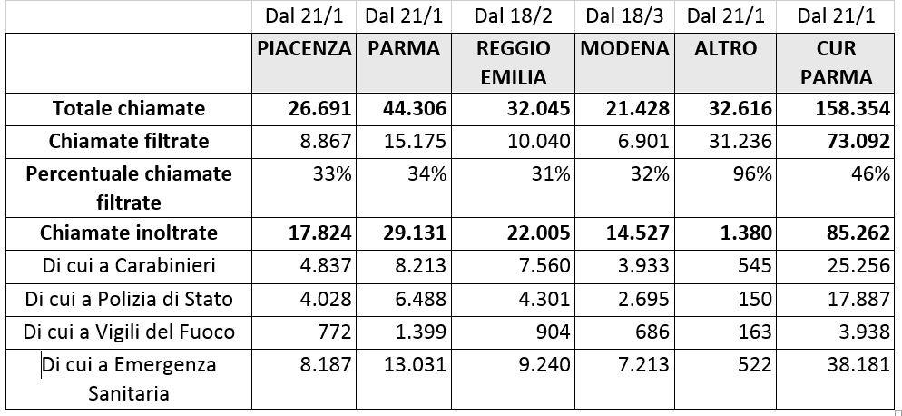 Tremila chiamate al giorno dai territori di Piacenza, Parma, Reggio Emilia e Modena. Tempo di attesa di 4,5 secondi per ricevere una risposta in caso di emergenza, grazie ai 45 operatori che garantiscono il servizio 24 ore su 24, pronti ad attivare l’intervento di Polizia di Stato, Carabinieri, Vigili del Fuoco e Soccorso Sanitario e Guardia Costiera.