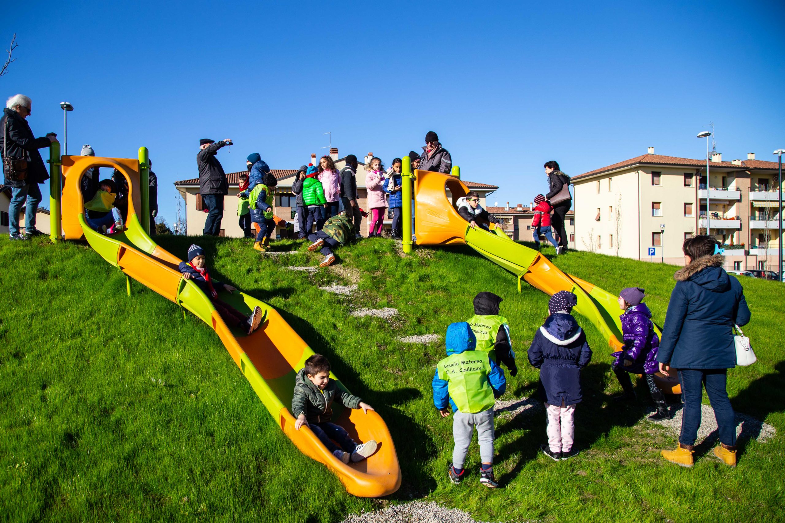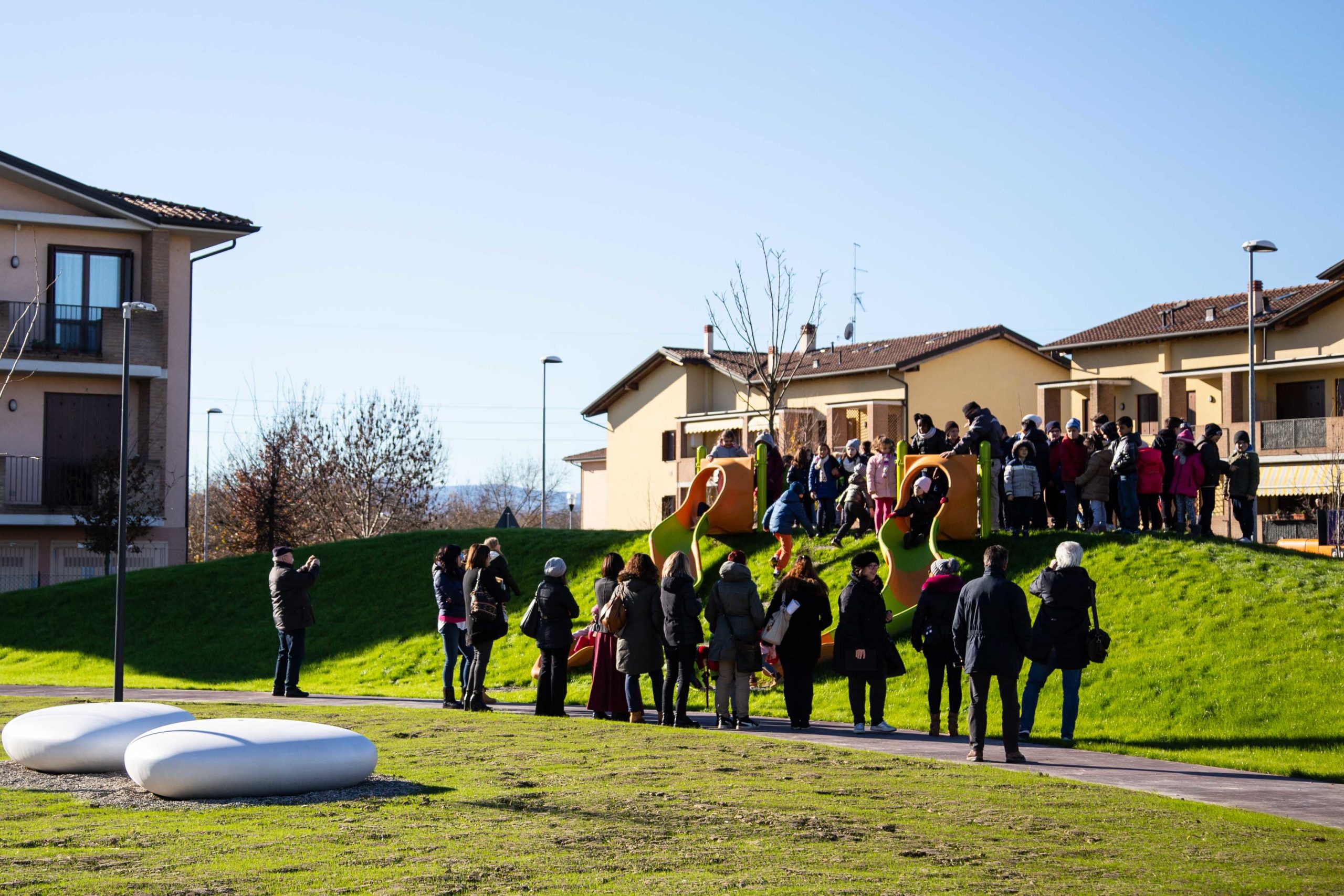 L’area interessata dall’intervento era un un semplice prato circondato da viabilità funzionale al quartiere, con un’area cani adiacente. Si trova nelle immediate vicinanze di un plesso formato da asilo nido e scuola materna, di cui rappresenta il naturale collegamento: si tratta, quindi, di un nuovo spazio strutturato per favorire incontri intergenerazionali tra fruitori adulti e bambini.