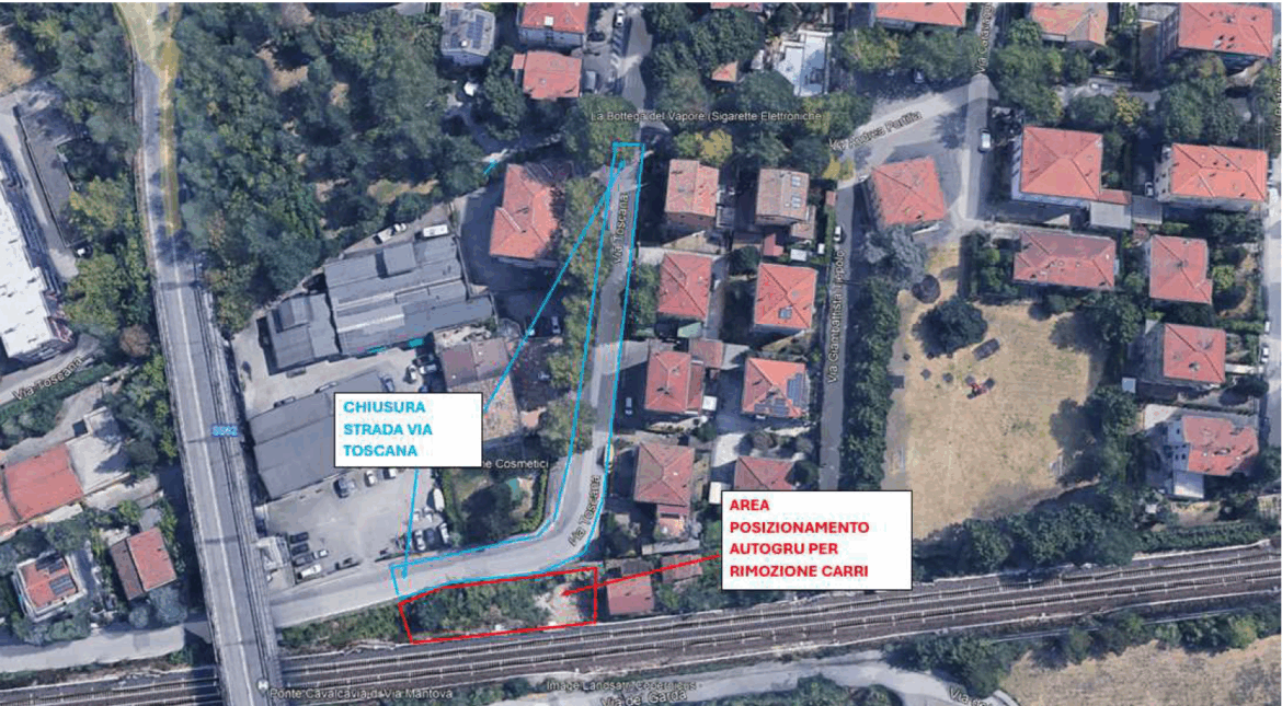 Essa prevede che dal 12 luglio, fino a cessate esigenze, in via Toscana, tratto compreso tra via Strobel e il sottovia stradale con via Mantova: divieto di sosta con rimozione forzata ambo i lati 0-24h.