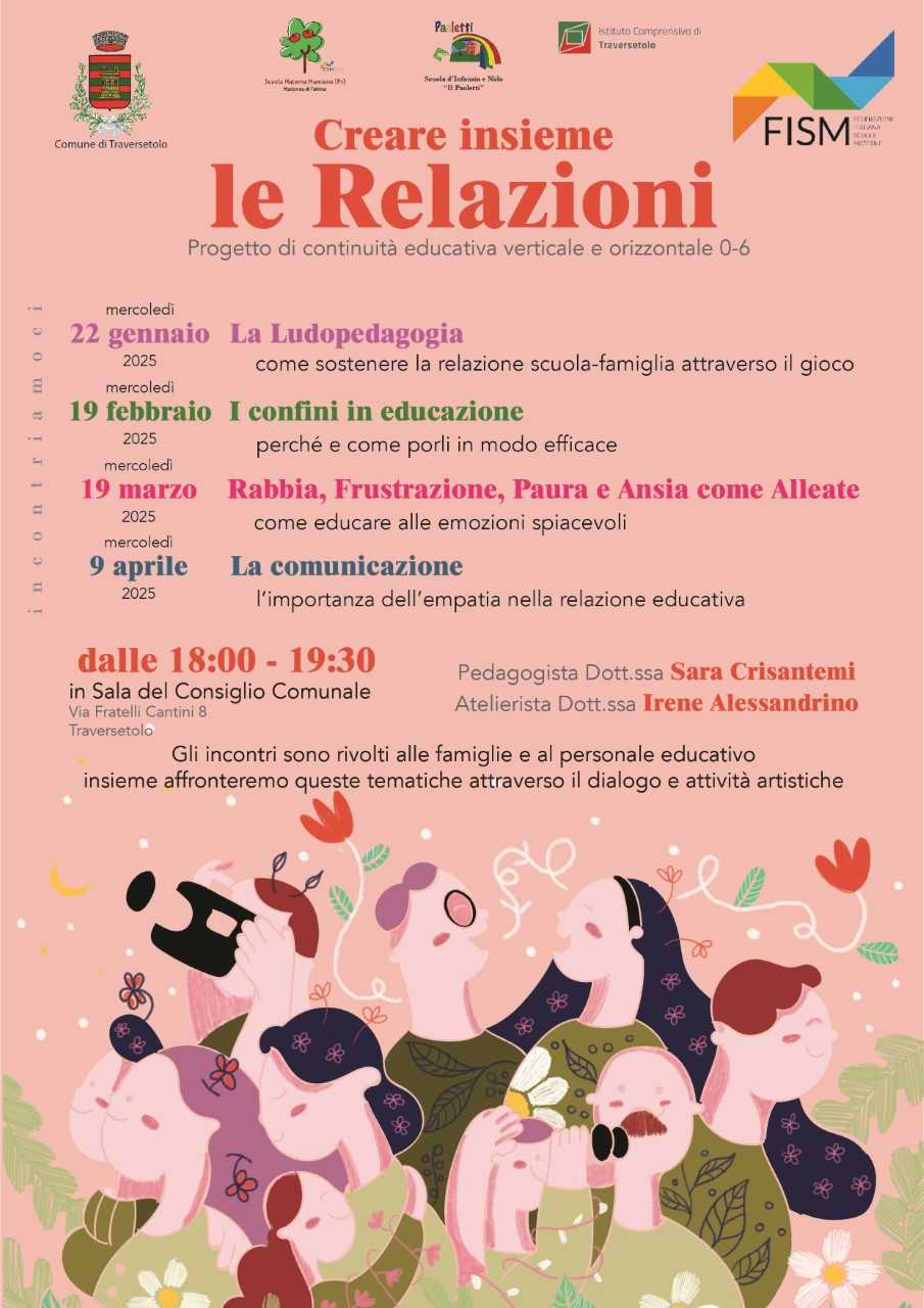 La progettualità educativa e pedagogica del Progetto di continuità orizzontale e verticale dei servizi 0-6 anni del Comune di Traversetolo quest’anno è incentrata sul tema della relazione a 360 gradi, intesa come relazione tra le persone (i bambini e le bambine, le famiglie, il personale educativo), con il territorio, con i materiali. Il progetto vede coinvolti l’istituto comprensivo di Traversetolo, la scuola materna “Madonna di Fatima” di Mamiano, il nido e scuola dell’infanzia “Il Paoletti”.