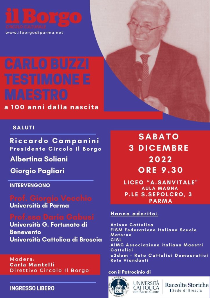E’ in programma per sabato 3 dicembre alle ore 9.30 nell’Aula Magna del Liceo “Albertina Sanvitale” (P.le San Sepolcro,3), un incontro dal titolo “Carlo Buzzi testimone e maestro”, promosso dal Circolo Il Borgo, con il patrocinio dell’Università Cattolica di Brescia, a cento anni dalla nascita dell’ indimenticato parlamentare parmigiano.