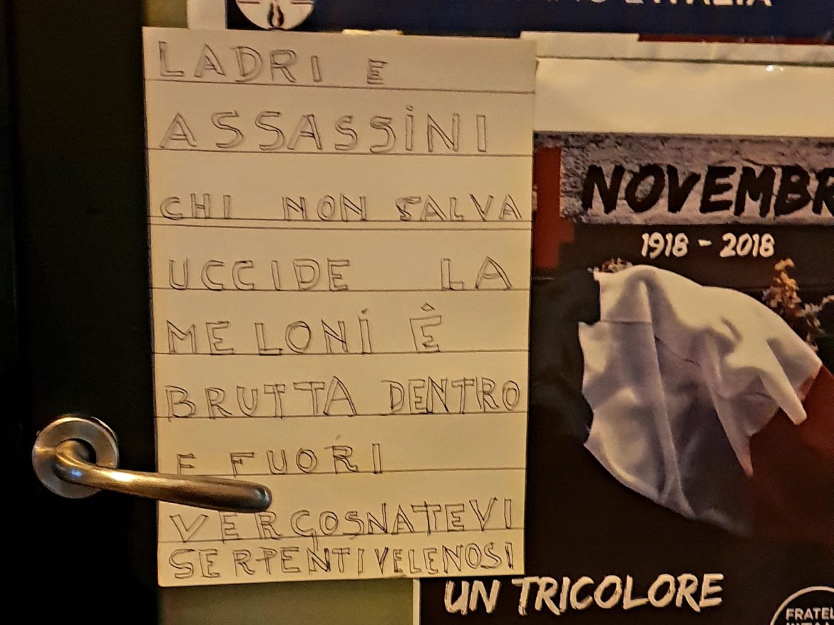 Questa sera attaccato alla vetrina della sede di Fratelli d’Italia di Fidenza abbiamo trovato un foglio, rigorosamente anonimo, con le solite frasi odiose, insultose e becere che spesso vengono pronunciate da coloro che non hanno capito nulla circa la buona politica e che vivono nella più completa cecità mentale.