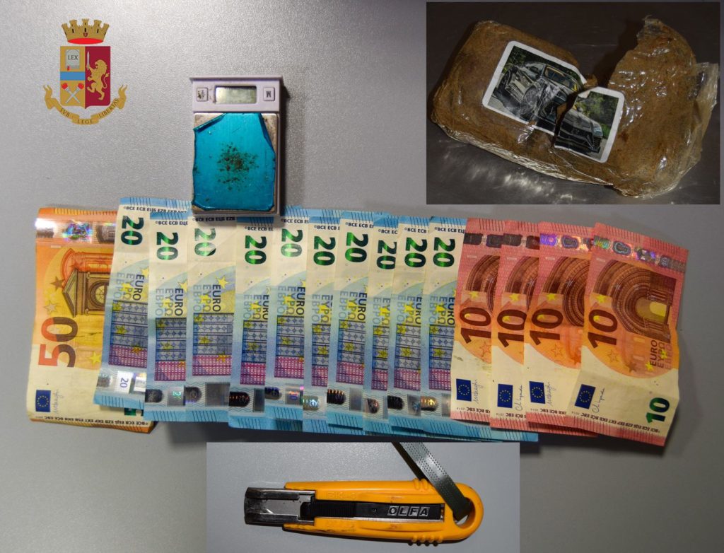 Gli occupanti venivano fatti scendere dall’auto per essere controllati. Il 22 enne risultato poi essere il proprietario del veicolo, manifestava sin da subito evidenti segni di nervosismo. Sottoposto a perquisizione personale, nascosti negli slip venivano trovati due involucri di cellophane contenente sostanza stupefacente, risultata poi essere hashish, un bilancino di precisione e la somma di 290 ero suddivisa in tagli da 20 e 10. La perquisizione estesa al veicolo permetteva di trovare un taglierino nascosto sotto il sedile. La successiva perquisizione fatta presso il domicilio del giovane consentiva di trovare due involucri contenete frammenti del tipo hashish.