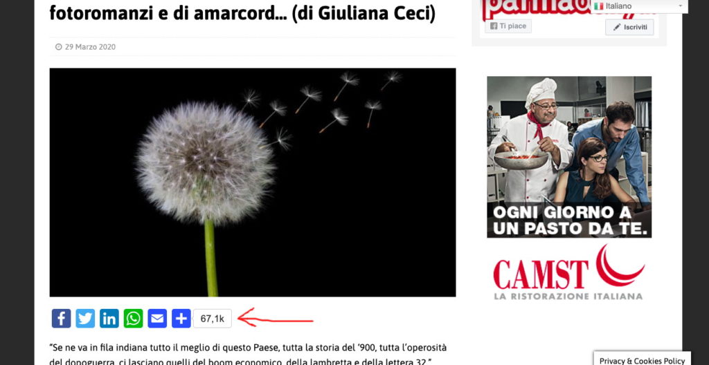 Qualche settimana fa Giuliana scrisse un post sull’emergenza Coronavirus pubblicato da ParmaDaily (leggi: Se ne vanno nel nero silenzio che puzza di amuchina i nostri anziani, quelli dei dik dik, dei fotoromanzi e di amarcord…). L’articolo ha avuto un successo incredibile, al punto che è stato condiviso su Facebook ben 67.100 volte. E’ stato l’articolo più condiviso da quando il nostro giornale è online.