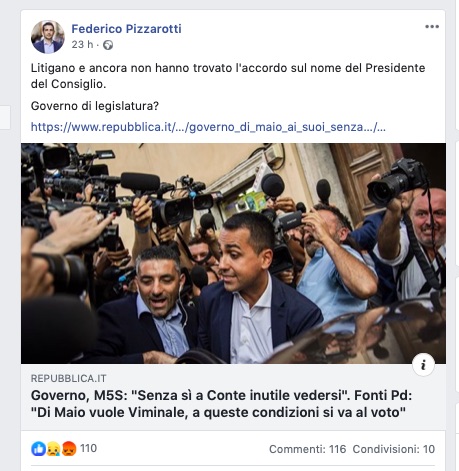 Scrive Pizzarotti su Facebook: “Presidente Mattarella, suoni il gong e svegli tutti da questa crisi di governo più surreale della storia della Repubblica #Rousseau”; “Litigano e ancora non hanno trovato l’accordo sul nome del Presidente del Consiglio. Governo di legislatura?”