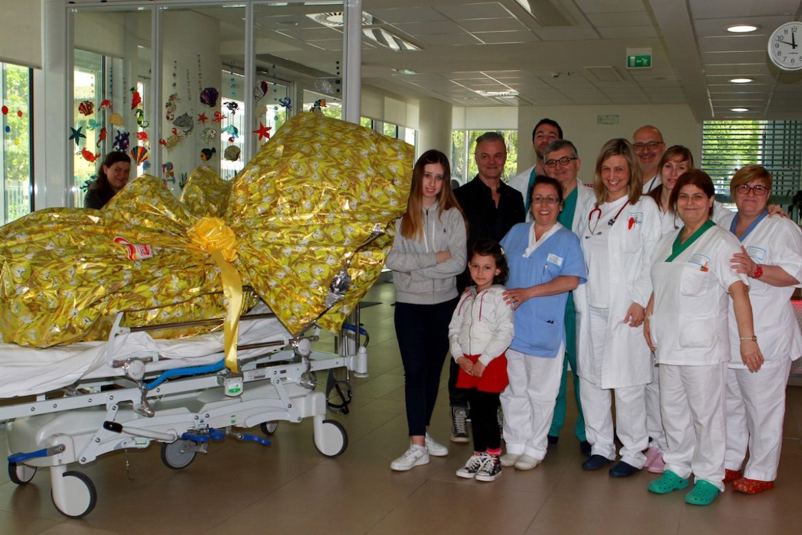 Una barella che entra all’Ospedale di bambini per portare un uovo di Pasqua grande trenta chili; un metro e 70 di dolcezza pensata da dipendenti e direttore della Coop Centro Torri per i bambini della Pediatria generale e d’urgenza.