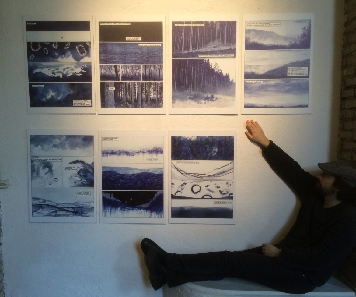 Immagini allegate: Bernardo Cinquetti con alcune tavole di “Un viaggio nelle Ardenne” e la copertina del volume