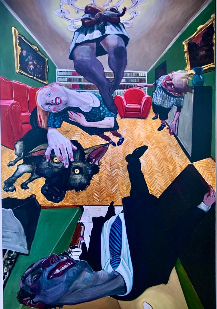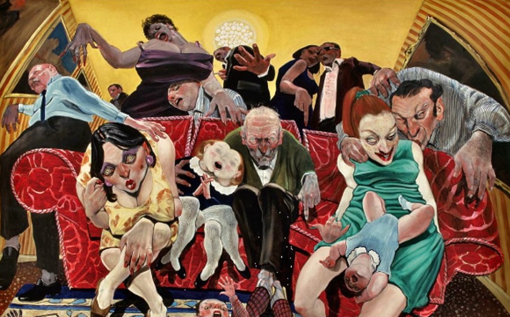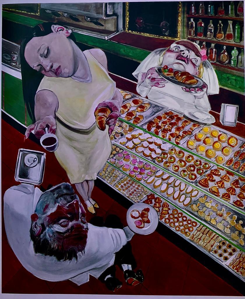 Un esempio? Ne “il ritorno di papi” si vede la famiglia che aspetta con gioia – finta invero – che il boss rientri dal lavoro. Ma spostando l’occhio si vede anche il momento del ritorno e, mentre l’uomo chiude la porta, nella stanza scoppia il finimondo. Addirittura il figlio ascende al cielo, il lampadario gira per la stanza, i mobili sussurrano parole incomprensibili. Poi tutto finisce e restano solo gli occhi sbarrati del cane di casa, Pilén, che in realtà sono gli occhi dello spettatore appoggiato alle pareti del museo che, sopraffatto dall’intensità della scena, cerca di capire: che quadro è? Ottimista o pessimista, spaventoso o rassicurante, divertente o spiritoso? A guardare bene Pilén, si direbbe che il quadro è la vita nella sua essenza. Con alti, bassi, drammi, fortune. Pianto, sì pianto, ma anche qualche grassa risata per tirare avanti. E tanta finzione. Perché finzione? Perché la vita stessa è un intero recitato e i personaggi di Robusti recitano la vita. E Robusti gratta dentro l’anima, fruga e scopre, nei suoi quadri, tutto ciò che è falso, che luccica ma non ha luce, che seduce senza un motivo. Scopre l’uomo – e la donna – nella sua essenza: il mangiatore insaziabile che divora la vita e vuole possedere tutte le donne (o gli uomini, se giriamo al femminile). Aggressivo, cattivo.