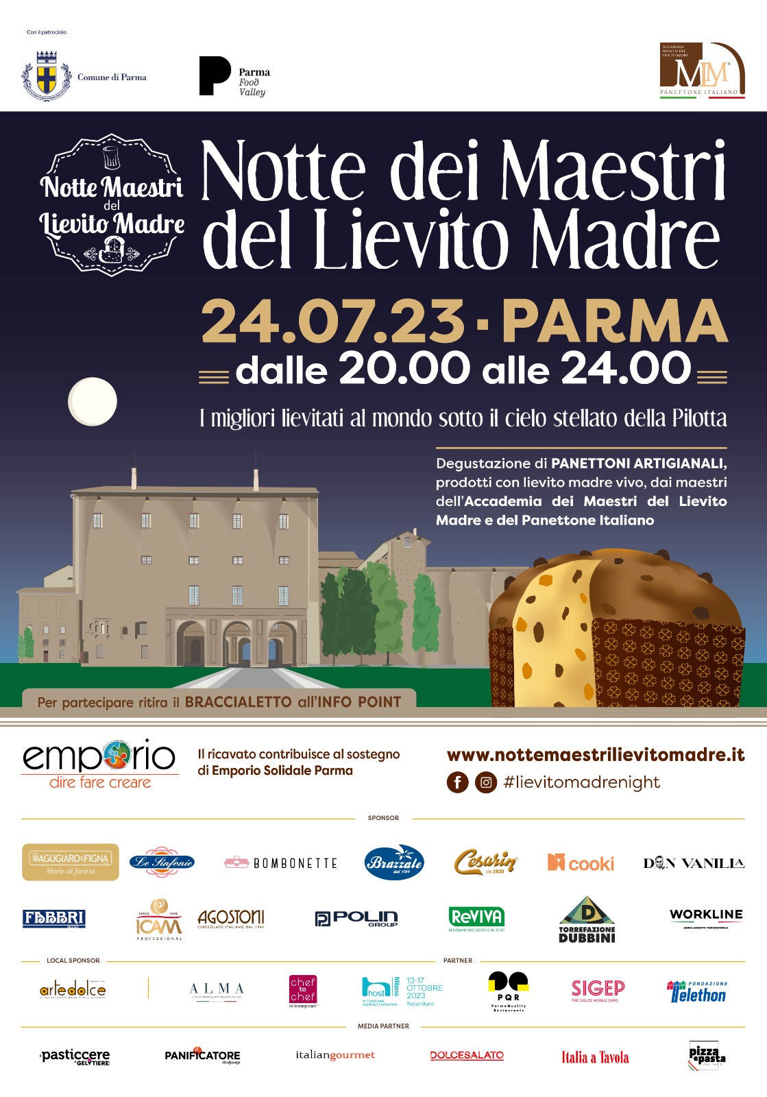 Basta un solo ingrediente, il lievito madre fresco, per illuminare il centro storico di Parma: torna il 24 luglio, La notte dei Maestri del lievito madre, una serata all’insegna dell’artigianalità organizzata dall’Accademia dei Maestri del Lievito Madre e del Panettone Italiano con il patrocinio del Comune di Parma e Parma Food Valley, sotto il cielo stellato della Pilotta.