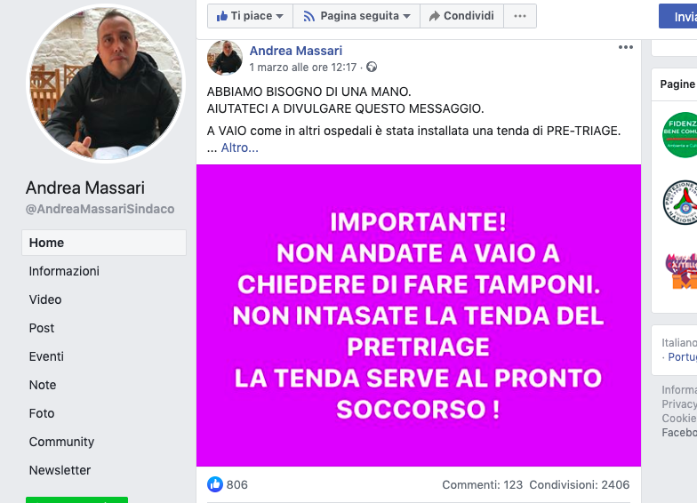 La pagina di Massari è forse diventata un (il?) punto di riferimento provinciale delle informazioni sul contagio, più delle pagine degli altri sindaci della provincia, delle Istituzioni di Enti, Aziende Sanitarie, Ospedali, ecc.