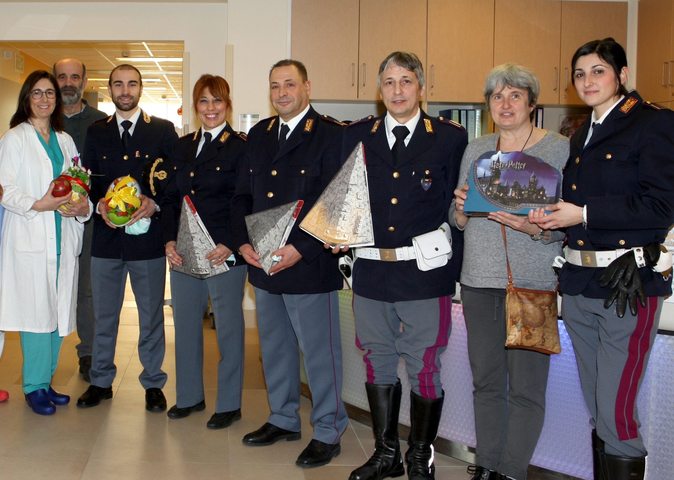 Ad accompagnare i poliziotti Corrado Vecchi, presidente dell’associazione Giocamico onlus che da vent’anni promuove attività ludico ricreative dei reparti pediatrici del Maggiore, la dottoressa Angelica Barone con la coordinatrice infermieristica dell’Oncologia Maria Luisa Zou, la bed manager Mira Calmetta e il dottor Icilio Dodi con la caposala Claudia Marcatili della Pediatria generale e d’urgenza.