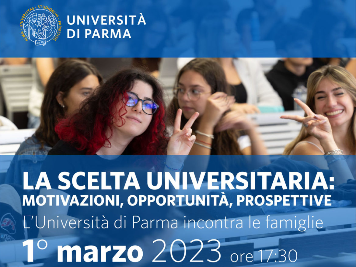 L’Università di Parma incontra le famiglie per parlare di “scelta universitaria: motivazioni, opportunità, prospettive”. L’appuntamento è per mercoledì 1° marzo alle 17.30 in presenza, nell’Aula dei Filosofi della Sede Centrale dell’Ateneo (via Università 12), e in diretta streaming sul canale YouTube Unipr (https://youtu.be/ExGYQs8Zo-I).